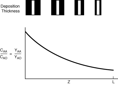 | where the units of C A and k are mol/dm 3 and dm/s, respectively. Deposition takes place on the reactor walls, the support, and on the wafer surfaces. The corresponding depletion of reactant gas on each of these surfaces is | |||