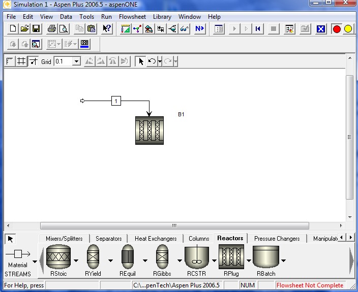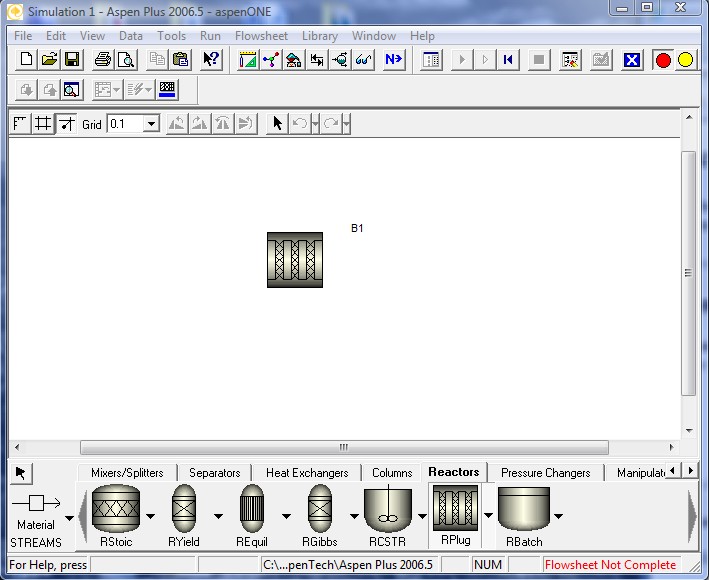- You should now see an icon for a plug flow reactor on the process flow sheet. It will arbitrarily be named B1. (you can change the name later)