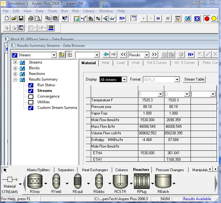 Note that, down the left side of the screen, are the different parameters: temperature, pressure, mole flow, etc. Along the top row are the stream id names, in this case 1 and 2 (inlet and product). This forms a grid of information that can be interpreted easily.