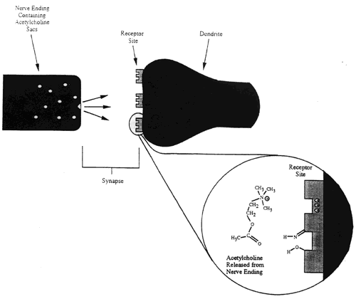Human respiration is dependent upon the interaction of acetylcholine molecules with acetylcholine esterase receptors on the diaphragm muscle. Each time a person takes a breath, nerve endings that contain "sacks" of acetylcholine are stimulated. Each sack has roughly 1 x 1014 acetylcholine molecules inside. The sacks move toward the end of the nerve and eventually strike the wall of the nerve. The force of the collision causes the sacks to release the acetylcholine molecules into the neuromuscular junction or synapse.