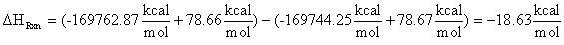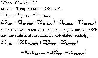 Another little speed bump is that the GSE does not take into account the energy contained in the vibration, rotation, and translation of the molecule. This energy can be accounted for by using statistical mechanics (the program will do this). In statistical mechanics one can use the molecular frequencies calculated by the program and calculate thermodynamic quantities. We will be using the statistical mechanically calculated enthalpy and entropy, this enthalpy and entropy only takes into account the energy in the vibrations, rotations, and translations so it is not representative of the total energy of the molecule, because a large portion of the energy in a molecule is contained in its bonds and physical conformation. That is why we must take the sum of the GSE and the statistical mechanically calculated enthalpy to arrive at a closer approximation of the true energy of the molecule. With that said we will now define a slightly modified version of the heat of reaction equation: