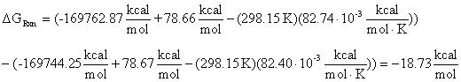 Variable Definition Value Units ZPE ( T = 0 K ) Zero point Energy +74.29 kcal/mol GSE ( T = 298.15 K ) Ground State Energy -169744.25 kcal/mol H ( T = 298.15 K ) Enthalpy +78.67 kcal/mol S ( T = 298.15 K ) Entropy +82.40 cal/mol K G = H - T*S Gibbs Free Energy +54.10 kcal/mol