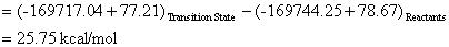 After drawing a plausible configuration of the transition state we run a transition state search and are able to find the true transition state. Which is characterized by an imaginary frequency in the direction of the reaction and also obtain thermodynamic quantities. The data output at STP in tabular form for the transition state is: