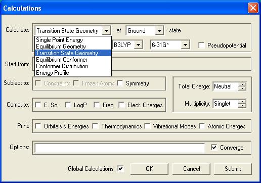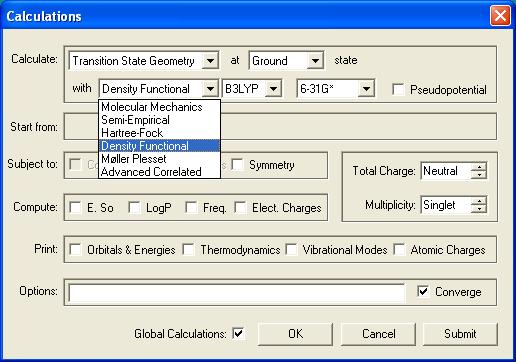 and, click the box next to Freq. and Thermodynamics so we can compare the values to the reactant values. Then click submit. This calculation should take around thirty seconds to a minute on a 2.4 GHz computer and up to five minutes on a less powerful computer. So don't change that channel, we will be right back!