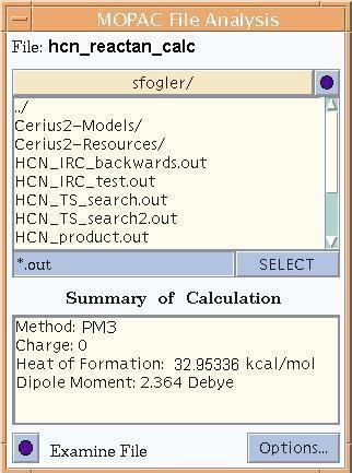with the heat of formation and dipole moment shown in the lower portion. Left click on the Examine File button to show a text form of the output of the calculation. Scroll through the data and record the heat of formation, the enthalpy, the heat capacity, and the entropy all at 300K. We will be using this later.