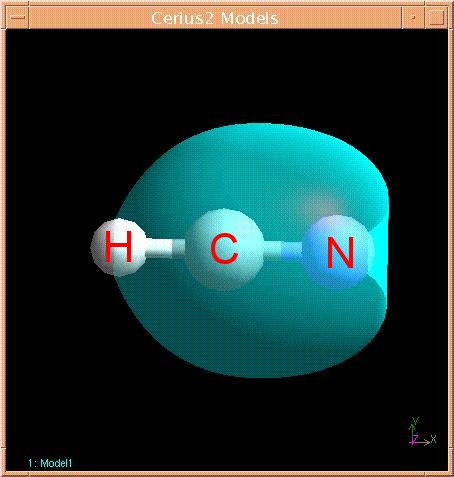 27. Left click on the first orbital and then left click on the calculate button in the upper left hand corner of the orbitals window. Another window will pop up and show that the orbital is being calculated. After the calculation is finished the HCN molecule in the models window should be surrounded by a somewhat spherical light blue orbital. The first orbital should look like this: