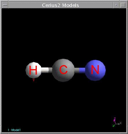 11. Left click and hold on the clean button in the lower left of the sketch window until the HCN molecule stops moving, indicating that the program has roughly minimized the molecules energy. Your HCN molecule should look something like this: