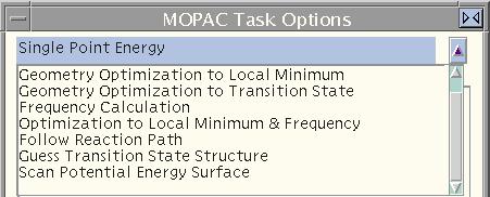 - single point energy : This function calculates molecular orbitals, heat of formation, and requested thermodynamic quantities for the molecule drawn in the modeling window. This calculation does not optimize the geometry of the molecule.