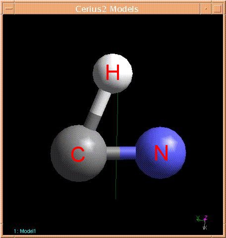 so we can change the HCN angle. In the models window left click on the hydrogen then the carbon then the nitrogen to define the angle we will change. Be careful to left click exactly in the center of each atom because where you left click is the exact point the angle will be defined from. After you have defined the angle do not move the mouse outside the model window until after step 4.