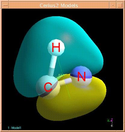 13. Now open the orbitals window via the analyze menu and view the molecular orbitals of the transitions state HCN molecule. Notice the second molecular orbital shows the electron sharing between the hydrogen and the nitrogen.