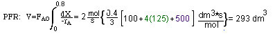 $V=F_{A_0}\int_{0}^{X}\dfrac{1}{-r_A}dX=\dfrac{\Delta X}{3}\Big{[}\dfrac{1}{-r_A(X=0)} + \dfrac{4}{-r_A(X=0.4)} + \dfrac{1}{-r_A(X=0.8)}\Big{]}$