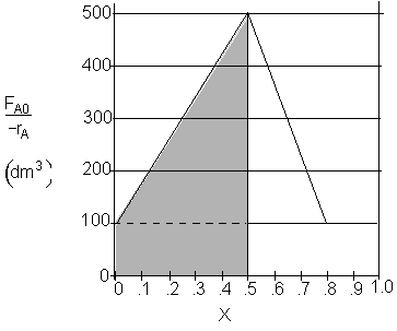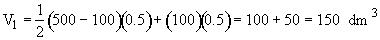 $V_1 = \dfrac{1}{2}(500 - 100) (0.5) + (100)(0.5) = 150 dm^3$