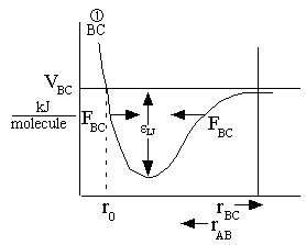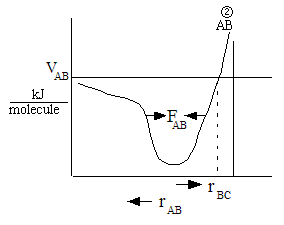A potential similar to atoms B and C can be drawn for the atoms A and B. The F shown on the figures represents the attractive force between the molecules as they move in the direction shown by the arrows. That is the attractive force increase as we move towards the well (ro) from both directions, rAB>ro and rAB<ro.