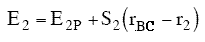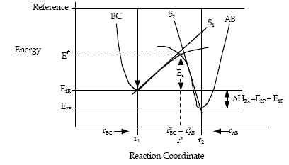Let S2 be the slope of the AB trajectory between r2 and rBC=rAB = r*. Similarly for AB, starting on the product side at E2P, as the distance rAB increases the distance rBC decreases and the energy E2 at a distance rBC is