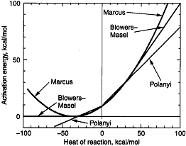 The Polyani equation correlates activation energy with heat of reaction. This correlation