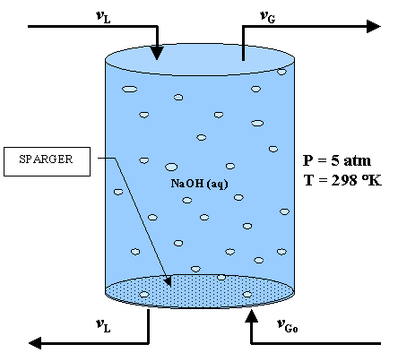 After reading the journal review by Y. T. Shah et al. [AIChE J., 28, 353 (1982)], design the following bubble column reactor. Sixty percent carbon dioxide (CO2) in a flue gas is to be removed by bubbling through a solution of sodium hydroxide (NaOH). The reaction is mass-transfer limited. Calculate the reactor size (length and diameter) necessary to remove 99.9% of the carbon dioxide.