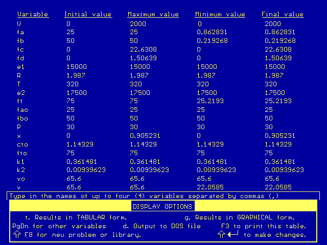 We found that at 320 K and 25 atm, our PFR exceeds the requirements. Our flow rate of product is 23.1 mol/sec. That translates into a conversion of 92.3%. An example of the results can be seen in the Polymath output below: