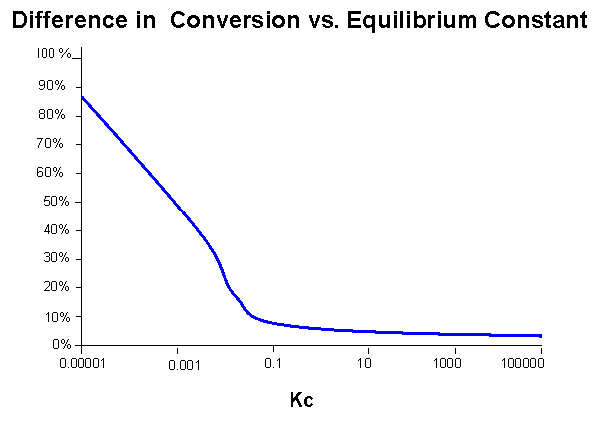 Although the difference in conversion looks nearly constant, the percent difference in conversion (see the graph below) increases significantly at lower KC values.