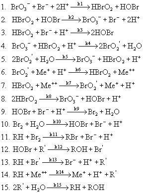 In the above scheme, BrO2', R', and Br' are free radical intermediates. RH is malonic acid and Me represents a metal ion. Notice that reactions #1 and 2, #4 and 5, #6 and 7, and #9 and 10 are essentially the same reaction, with one case being the reverse of the other. Because of this, in writing the rates of reaction we can reduce the number from 15 to 11. These 11 rates are shown below, with respect to a single mole of reactant.