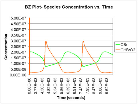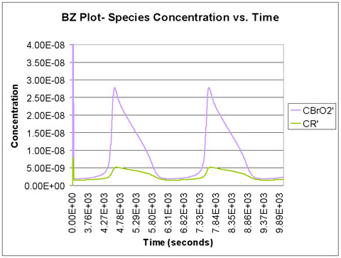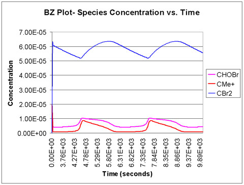CBrO3 represents the stationary concentration of BrO3-, CRH represents the stationary concentration of RH, and CSumMe is the sum of the Me+ and Me++ concentrations. Putting the BZ scheme into Polymath with the appropriate rate constants, we get the following program.