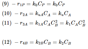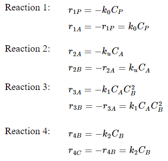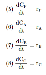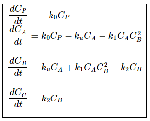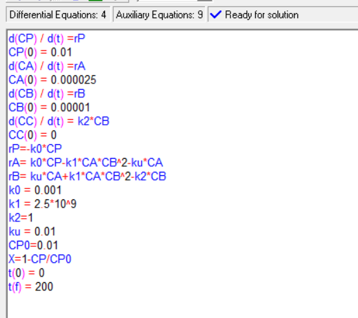 We can now put the final batch mole balances and the values for the rate constants into an ODE solver, such as Polymath. We will use the following initial concentrations: CPO=0.01 mol/dm3, CAO=2*10-5 mol/dm3 , CBO=1*10-5 mol/dm3, and CCO=0. The Polymath code will look like this: