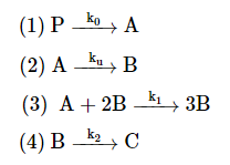 The main species important to the oscillation in this reaction are NaIO3, IO3-, I-, and I2.To make things easier in writing the mole balances and rate laws, we will say that: P = NaIO3, A = IO3-, B = I-, C = 1/2 I2. The series of reactions can then be written as: