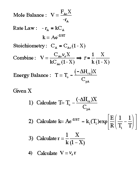 Given X Find T and V Also given k, E, CPA=CPB, , CAo, and vo Solution Back to CSTR Algorithm