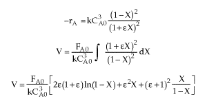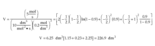 Mole Balance Rate Law Stoichiometry gas phase, isothermal (T = T0), no pressure drop (P = P0), CAo=CBo (Q=1), v=vo(1+eX) Combine Parameter Evaluation CAo=0.2, v=vo=25 dm3/s, k=10 dm6/mol2 s, e=0.5, X=0.9 V=227 dm3