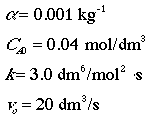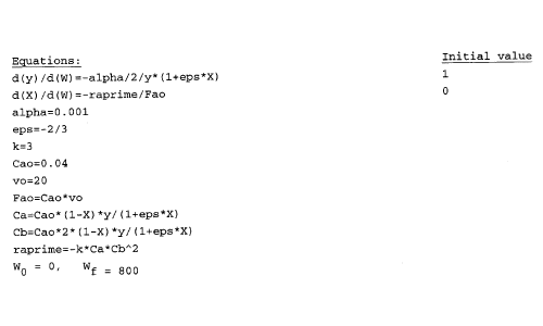 1) The rate law is incorrect. It should be:2) The concentrations are incorrect, the feed is stoichiometric.