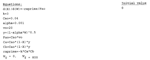 The elementary gas phase reaction A + 2B --> C is carried out in a packed bed reactor. Calculate the exit conversion from a PBR packed with 800 kg of catalyst. The feed is stoichiometric.