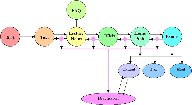 In the material presented here, the four-hour junior level chemical reaction engineering course at the University of Michigan has been divided into 20 units which you can complete at your own pace. The main core of the learning process will be the textbook. The textbook is supplemented by the CD ROM, which accompanies the book, and the Internet. The lecture notes on the CD and Internet are interactive with a number of self tests, additional examples and audio. In addition, there are interactive computer modules and a number of frequently asked questions (FAQs) for each chapter on the CD ROM.Below is a picture that summarizes the intended flow and progression of asynchronous learning.