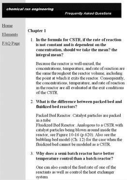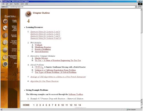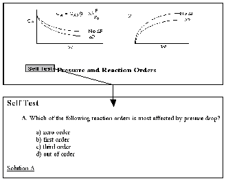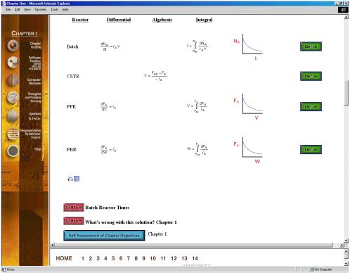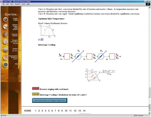 ChE 344 was the first class chosen in the department of chemical engineering to be offered through asynchronous learning because of the enormous course resources that had been built up over the years. In addition to the textbook, Elements of Chemical Reaction Engineering, 3rd Edition by H. Scott Fogler[vi] each student is provided with an interactive CD and the class web page (URL: http://www.engin.umich.edu/~cre/asyLearn or CRE URL: http://www.engin.umich. edu/~cre). The interactive CD includes: