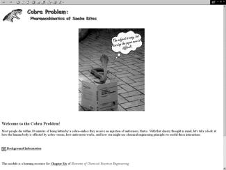 Simulations are also a major component of the CD, as web modules, interactive computer modules (ICMs) (Figure 6) and living example problems are included as well. The web modules (Figure 7) are stand-alone lessons that show novel applications of chemical reaction engineering principles. Each ICM has a description of the module, a review of the fundamentals, and an interactive scenario on which the students are graded by the computer (Figure 8). The living example problems are a new concept. Here, the examples in the textbook are also on the CD ROM so that they can easily be loaded onto the students’ computer. Living example problems are designed for students to easily vary parameters in the text example problems in order to understand real life problems and ask “what if” questions that allow them to practice their creative and critical thinking skills. The eight ICMs and six Web Modules are well suited for active and sequential learners. The ICMs allow students to ask “what if” questions as well as enjoy practicing reaction engineering concepts, while the Web Modules enable students to learn how reaction engineering principles can be applied to a variety of real world situations. The CD also features a Professional Reference Shelf, which includes material important to the practicing engineer, which is typically not included in the majority of chemical reaction engineering courses.