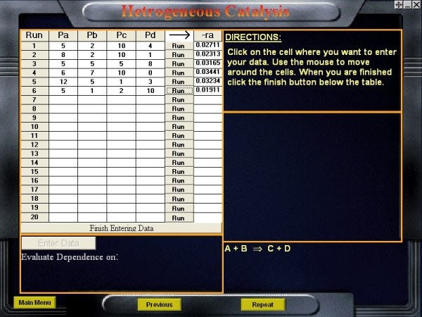 The student must derive the rate equation for a given reactive system by analyzing the rate data obtained in a differential reactor. The student must choose which experiments to run, that is, the entering pressures of each species and total flow rate. In order to obtain the dependence of the rate equation on the pressure of a given species, the student must select which of the points are to be included in a plot of reaction rate vs. species partial pressure. Given the requested plot, the student must determine the form of the dependence of the rate law on the pressure of the given species:
