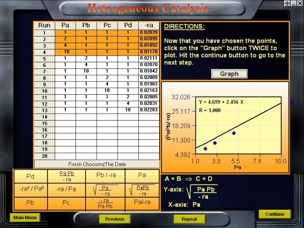 Once all dependencies have been established, the student must decide which rate law parameters can be determined, through judicious plotting of the experimental data. The review section also outlines the derivation of the governing equations of heterogeneous catalysis: