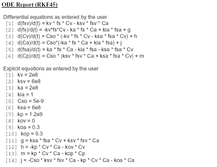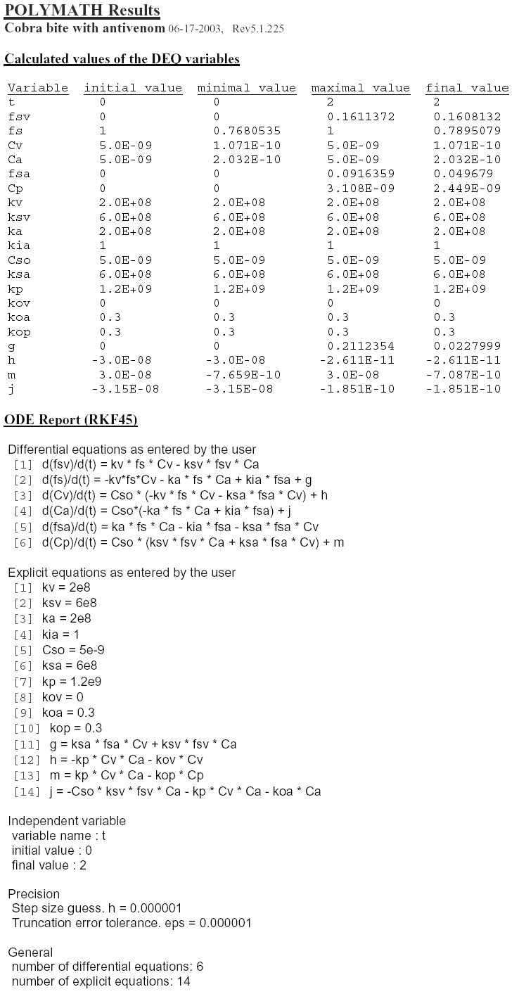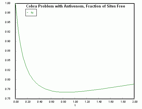 So what happens if we do inject antivenom (and hopefully save the life of the snake-bite victim in the process)? The list of equations we'll use will be the same one we used initially, with one exception: our concentration of antivenom, CA, at time zero will be 5 x 10-9 M. This is an arbitrary value that we have chosen for CA, based on an extra tidbit of information that we have; namely, that the normal antivenom dose is typically 3.6 x 10-9 M (although it can be as high as 9.1 x 10-9 M). With this in mind, we decided to make the antivenom dose equal to the venom dose.