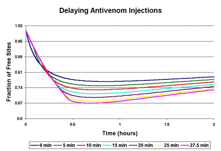 The following plot combines several of our models, with antivenom being initially administered to our friend, Jim, at 5 minute intervals.