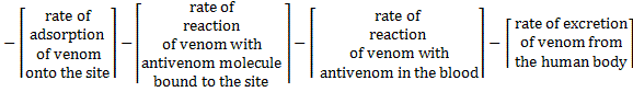 The amount of venom in the blood would continuously decrease as it gets consumed in various reactions: adsorption on sites (reaction 1), reaction with antivenom molecules bound to the site (reaction 3), reaction with antivenom in the blood (reaction 5) and excretion from the body (reaction 7).