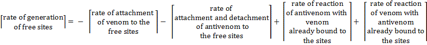 The number of free sites would change by irreversible attachment of venom molecules (reaction 1) and the reversible attachment of antivenom molecules (reaction 2) and the reaction of venom with antivenom molecules already bound onto the site and vice versa (reaction 3 and 4).
