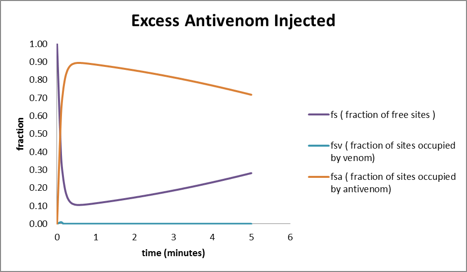 From the graph, we see that when the amount of antivenom administered is increased by around 10 times, the fraction of free sites drop down to around 0.10 at around 30 minutes. This means more than 85% receptor sites get blocked which can disturb the respiration process in humans.