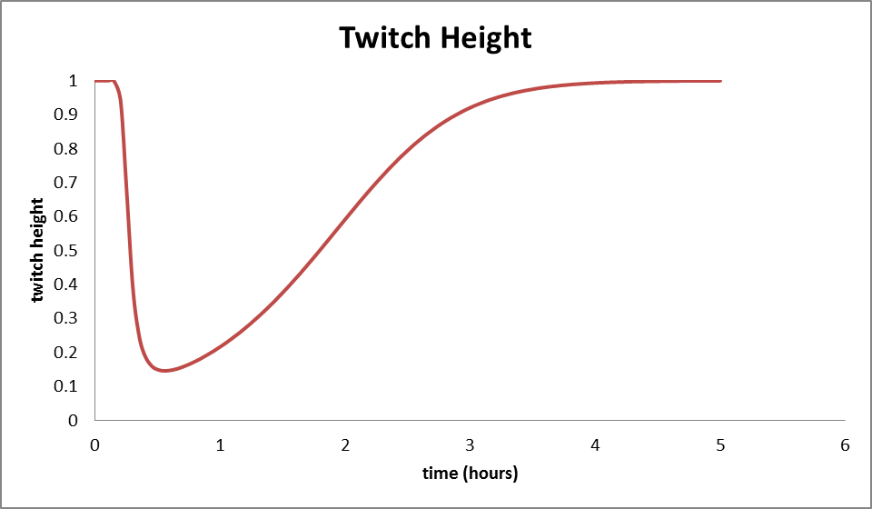 As we see in the graph, the twitch height remains close to one and the respiration system of the victim is expected to function normally throughout the duration.