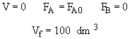 ODE Report (RKF45) Differential equations as entered by the user [1] d(Fa)/d(V) = -ka*Cto^2*(Fa/Ft)^2 [2] d(Fb)/d(V) = 0.5*ka*Cto^2*(Fa/Ft)^2 Explicit equations as entered by the user [1] Cto = 0.2 [2] ka = 10 [3] Ft = Fa+Fb [4] x = (5-Fa)/5