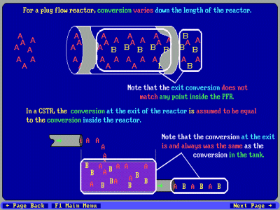 The student may at any time access a reference section that reviews the derivation of the design equations for PFRs and CSTRs, clarifying the change in conversion down a PFR, and the well-mixedness of the CSTR: