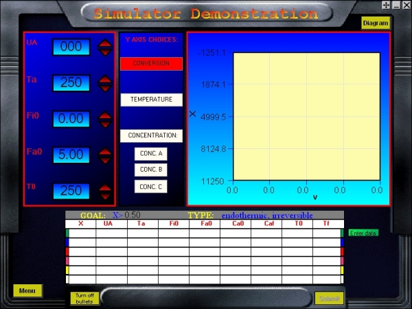 This simulation allows the student to explore the effects of various parameters on the performance of a non-isothermal plug flow reactor. The student may choose from eight simulations that span all combinations of exothermic/endothermic reactions and reversible/irreversible reactions, as well as a simulation that takes pressure drop into account. The variable parameters include the heat transfer coefficient, the inlet reactant flowrate, the diluent flowrate, the inlet temperature, and the ambient temperature: