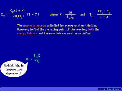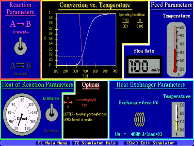 A simulator is also included in the review section. This allows the student to vary parameters and to observe the effects on the conversion-temperature relationships as described by both the mole balance and the energy balance. The parameters that may be varied include: feed flowrate, feed temperature, the reversibility/irreversibility of the reaction, heat of reaction, heat exchanger area, and heat transfer fluid temperature. The operating conditions can be determined from the intersection(s) of the mole balance and the energy balance: