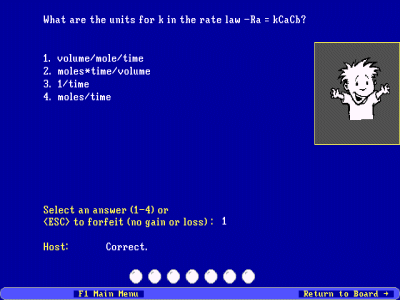 The interactive portion of the module is similar to that in Kinetic Challenge 1. Students can choose from four categories (reactants, products, rate law, potpourri) and four levels of difficulty (200-1,000 points). Each question has four multiple-choice answers, and students have a limited amount of time to make a response: