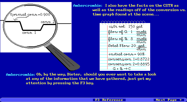 In the interactive portion of the module the student must solve a murder mystery, with the aid of Sir Nigel Ambercrombie, an English investigator. It seems that overnight there was a slight irregularity in conversion for the CSTR at the Nutmega Spice Company: