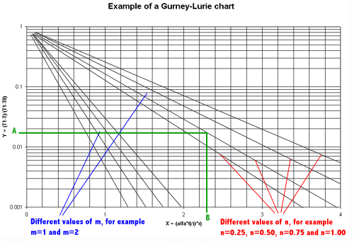 The chart below is only an example of how a Gurney-Lurie chart might look and is not based on any actual data. The chart shows how four different dimensionless groups depend on each other.