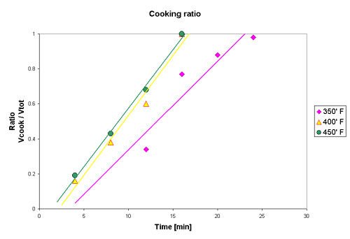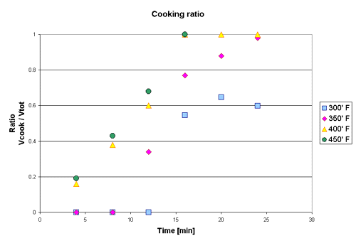 The radius at which the heat had been raised sufficiently for the structural breakdown to take place (i.e. the radius of the iodine rings) was measured as a function of time. The ratio of cooked potato volume and the total volume was plotted with respect to time for three different oven temperatures. As one can see the data suggests that the potato actually "uncooked" after 25 minutes in the oven at a temperature of 300° F. Uncooking a potato is of course impossible. Once the crystalline structure of the potato has been broken down it can not regenerate. The dataset collected at 300° F should therefore not be considered when further conclusion regarding the reaction are drawn.