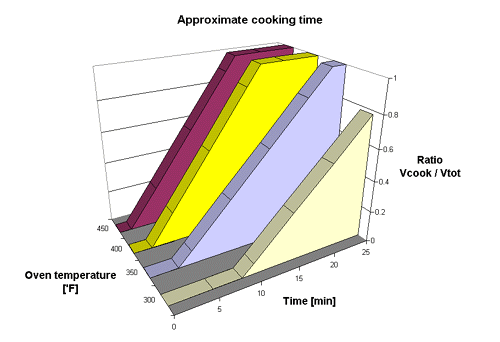 The third and last plot shows in a graphic way the approximate time it takes to break down the crystalline structure of a potato at four different temperatures. However as mentioned above the accuracy increases as the temperature increases so that while the part of the chart representing 300° is a relativly poor model of the reality the part representing 450° seems to model it quite good.